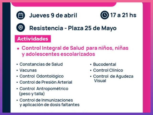 En el marco de una política de trabajo territorial, el Ministerio de Salud del Chaco llevará adelante una nueva jornada de atención integral destinada a niños y adolescentes en edad escolar, con el objetivo de acercar servicios sanitarios esenciales a la comunidad.