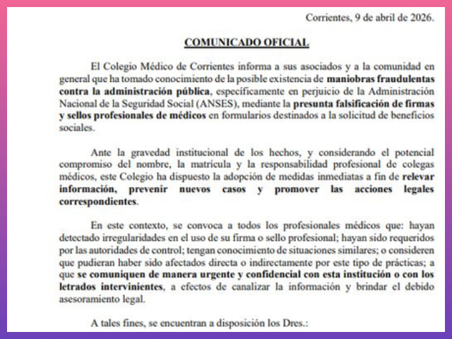 El Colegio Médico de Corrientes emitió un comunicado este jueves en el que alertó sobre la posible existencia de maniobras fraudulentas que afectarían a la Administración Nacional de la Seguridad Social (Anses). Según informaron, estas prácticas consistirían en la presunta falsificación de firmas y sellos de médicos en formularios utilizados para la solicitud de beneficios sociales.