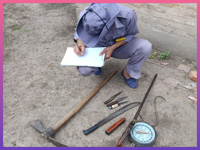 En el primero de ellos, los agentes secuestraron una balanza tipo reloj con gancho, una escopeta calibre 16 sin marca visible, dos cartuchos del mismo calibre, un machete, tres cuchillos y un pico de trabajo. En el segundo domicilio, en cambio, el resultado fue negativo.
