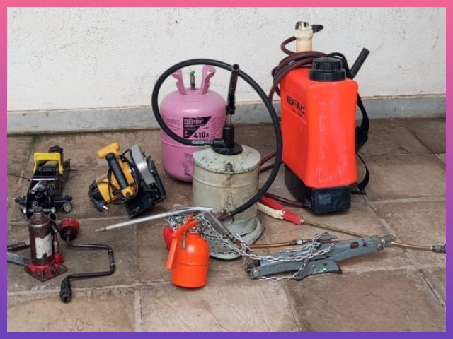 Entre los elementos robados se encontraban una mochila fumigadora, un tubo de gas para aire acondicionado, tres gatos hidráulicos de distintos tipos, una sierra circular, pistolas de lavado, un taladro, una grasera de pie, una batería de 120 amperios, además de llantas, machetes y herramientas de mano varias.