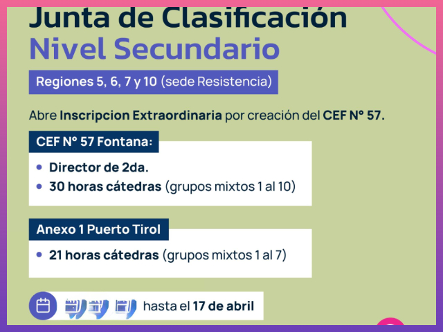 -CEF N° 57 (Sarmiento 751 -EES N° 36, Fontana): Director/a de 2da categoría, con 30 horas cátedra correspondientes a grupos mixtos del 1 al 10.