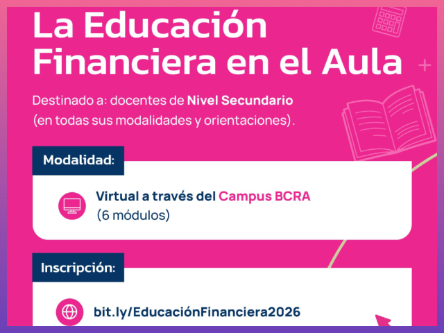 La cursada será bajo modalidad virtual, a través del Campus BCRA. Los docentes interesados podrán inscribirse mediante el siguiente enlace: https://bit.ly/EducaciónFinanciera2026
