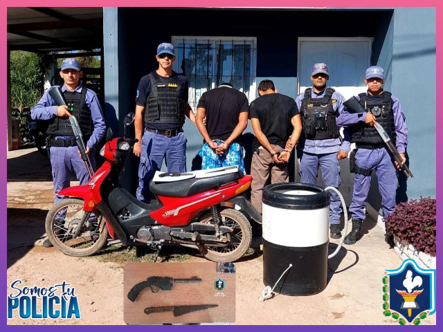 Durante el palpado corporal, se halló en poder de uno de los individuos un arma de fuego de fabricación casera, mientras que el segundo portaba un arma blanca de aproximadamente 30 centímetros de largo.