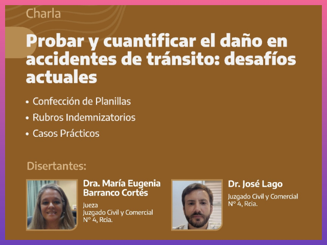 La disertación estará a cargo de la Dra. María Eugenia Barranco Cortés, jueza del Juzgado Civil y Comercial Nº 4 de Resistencia, junto al Dr. Lago José, secretario del mismo organismo, quienes compartirán su experiencia y perspectiva sobre los desafíos actuales en la materia.