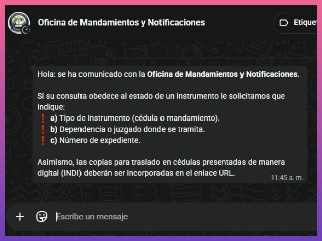 La Oficina de Mandamientos y Notificaciones (OMN) del Poder Judicial del Chaco incorporó una nueva vía de contacto para facilitar la atención a profesionales y usuarios. Desde ahora, las consultas pueden realizarse a través del número celular 362-4607776, mediante mensajería.