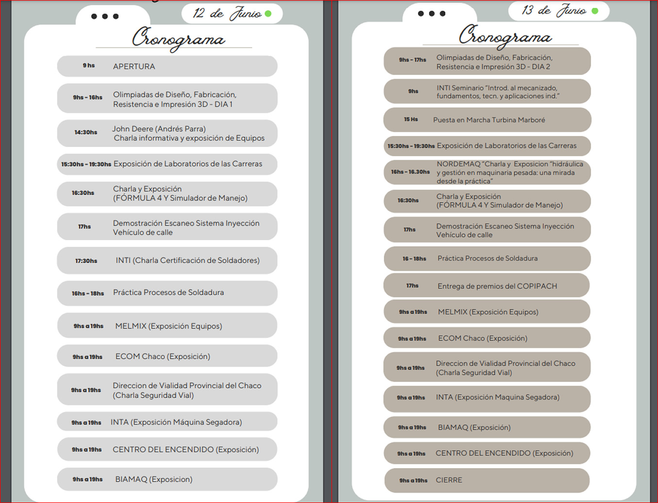 La agenda, que inicia el 12 de junio a partir de las 9, se extenderá hasta la tarde y continuará el día viernes 13, prevé lo siguiente: Olimpiadas de Diseño, Fabricación, Resistencia e Impresión 3D; John Deere (Andrés Parra) con una charla informativa y exposición de equipos; Exposición de Laboratorios de las Carreras; Charla y Exposición sobre un automóvil fórmula 4 y simulador de manejo.