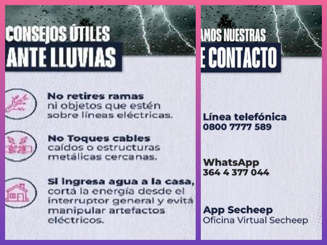 Desde la empresa energética provincial remarcan la importancia de extremar cuidados durante eventos climáticos adversos, ya que las lluvias, ráfagas de viento y zonas inundadas pueden generar situaciones de riesgo: