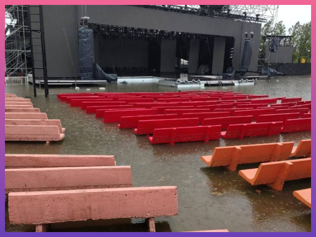 El agua cubrió por completo el sector de plateas y alcanzó el escenario principal, generando importantes daños en la infraestructura y comprometiendo el equipamiento técnico del predio.