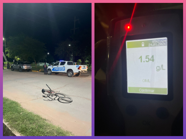 La otra parte, fue una bicicleta playera rodado 26, en la que se movilizaba un ciudadano de 49 años, quien debió ser trasladado al hospital local donde ingreso con un diagnóstico de “escoriaciones ambas rodillas, codo derecho y región nasal, posee aliento etílico”.