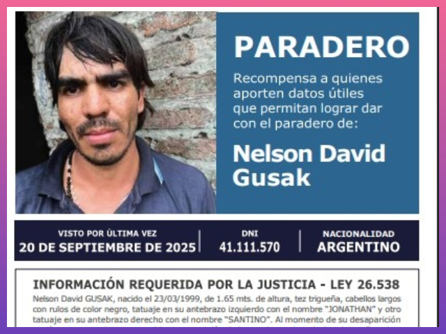 La búsqueda de Nelson David Gusak no se detiene, pero el paso del tiempo aumenta la preocupación de las autoridades y su familia. A más de cuatro meses de su desaparición, la Policía del Chaco y el Ministerio de Seguridad de la Nación ratificaron la vigencia de una recompensa de 5 millones de pesos para cualquier persona que brinde información certera que permita localizarlo.