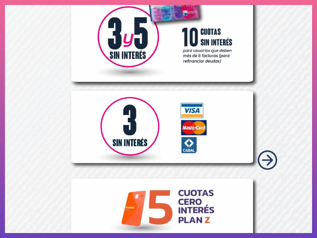 Con tarjeta Naranja, se puede pagar mediante Plan Z o en 5 cuotas sin interés. En tanto, con tarjetas Visa, Cabal y MasterCard, el pago puede realizarse en hasta 3 cuotas sin interés.
