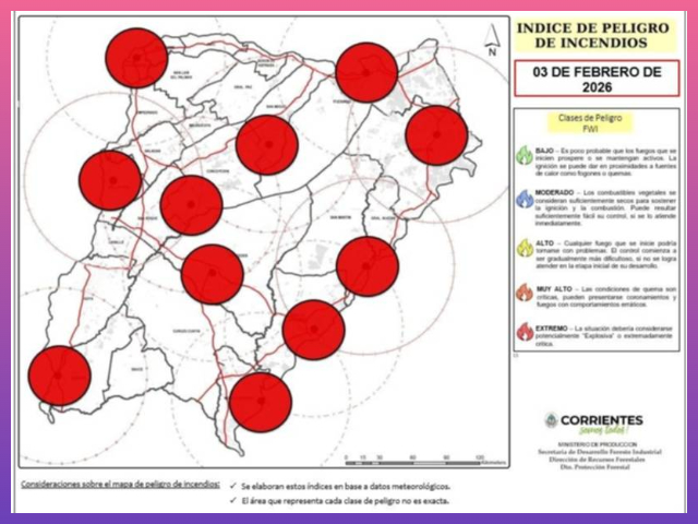 Por primera vez en lo que va del 2026, el riesgo extremo de incendios se extiende a toda la provincia de Corrientes. La alerta se extendió durante este martes, según el índice de peligro de incendios difundido por la Dirección de Recursos Forestales de Corrientes elaborado en base a datos meteorológicos.