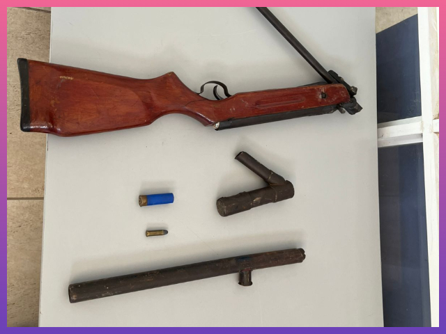 Como resultado del procedimiento, el personal policial procedió al secuestro de una escopeta de fabricación casera tipo “tumbera”, compuesta por dos caños de diferentes longitudes, un arma de aire comprimido modificada a calibre .22, además de cartuchos de calibres 16 y .38.