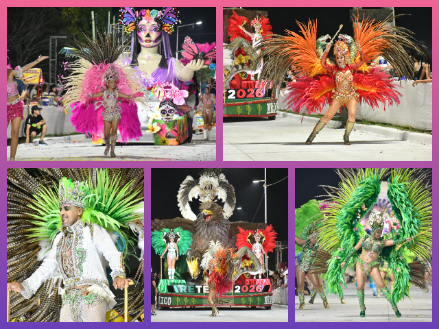 La velada estará protagonizada por las tres comparsas locales. Areté abrirá la noche con su presentación “México”; le seguirá Arco Iris, que realizará un recorrido por su historia; y cerrará Ará Tirí con su tema “Encantado”. Cada agrupación desplegará todo su esplendor con carros alegóricos, destaque, banda musical y batería, prometiendo un espectáculo lleno de color, alegría y contagiosa energía.