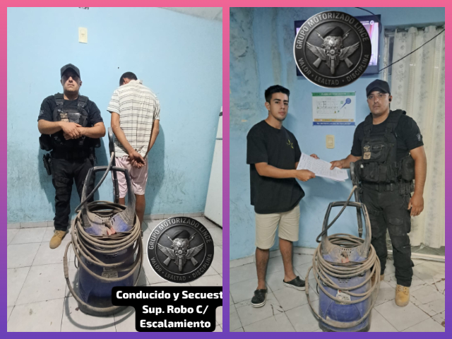 Tras proceder a la demora del sospechoso, se hizo presente el encargado del depósito de logística del lugar, quien reconoció la herramienta como propiedad de la institución y constató que un portón interno había sido forzado.