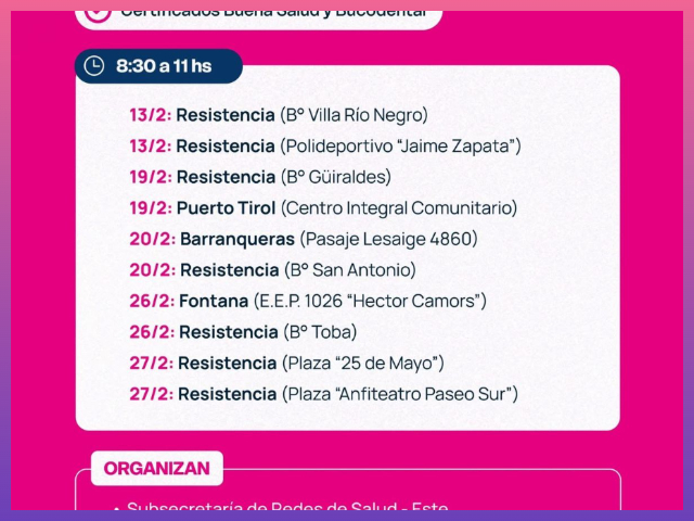 Para realizar los Certificados de Buena Salud y Bucodental, de 8:30 a 11 hs, se fijaron los siguientes lugares: