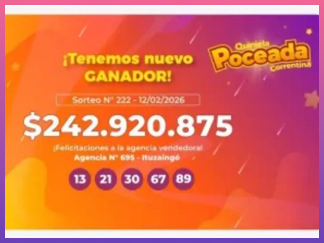 Un apostador de Ituzaingó se convirtió en el nuevo millonario de la provincia tras ganar más de $240 millones en la Quiniela Poceada Correntina. El premio extraordinario del 12 de febrero es de $242.920.875 correspondió a la jugada que acertó los cinco números que definieron el pozo acumulado.