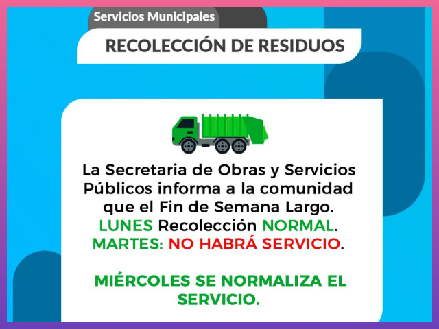 Desde la comuna remarcaron la importancia de respetar el cronograma y colaborar con la correcta disposición de los residuos domiciliarios, a fin de mantener la limpieza urbana durante los días festivos.