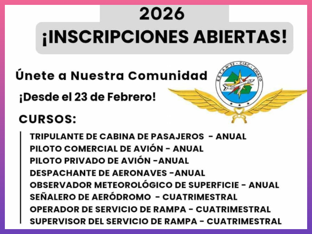 Entre los cursos disponibles se encuentran: Tripulante de Cabina de Pasajeros (anual), Piloto Comercial de Avión (anual), Piloto Privado de Avión (anual), Despachante de Aeronaves (anual), Observador Meteorológico de Superficie (anual), Señalero de Aeródromo (cuatrimestral), Operador de Servicio de Rampa (cuatrimestral) y Supervisor del Servicio de Rampa (cuatrimestral).