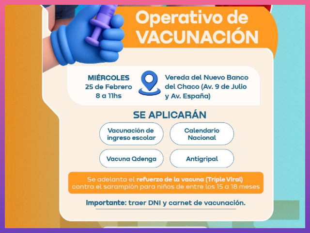Durante el operativo se aplicarán vacunas correspondientes al ingreso escolar, las incluidas en el Calendario Nacional, la vacuna Qdenga contra el dengue y la antigripal. Además, se informó que se adelanta el refuerzo de la vacuna Triple Viral contra el sarampión para niños de entre 15 y 18 meses.
