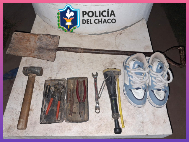 Tras tareas investigativas realizadas por los agentes, lograron la conducción de un ciudadano de 23 años, domiciliado en el barrio Lote 49. En su poder se secuestraron varios elementos, entre ellos una pala de punta de hierro, una caja plástica con herramientas, un par de zapatillas blancas y celestes, un martillo marca “CHACO” y un inflador.