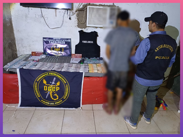 Durante el procedimiento fue aprehendido un ciudadano de 21 años, sindicado como principal investigado en la causa. En el lugar, los efectivos secuestraron: 23 gramos de cocaína, distribuidos en un trozo compacto y 40 bochitas fraccionadas. 9,3 gramos de marihuana, entre un envoltorio y 10 cigarrillos armados. $397.000 en efectivo. Una balanza digital con restos de cocaína, una cuchara con vestigios, recortes de polietileno, tijera, papelillos, rallador plástico y encendedores, entre otros elementos vinculados al fraccionamiento.