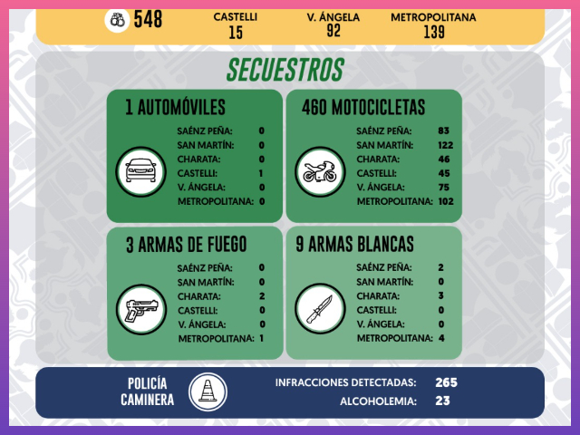 En Villa Ángela, el personal llevó adelante 56 operativos, demoró a 92 personas e incautó 75 motocicletas.