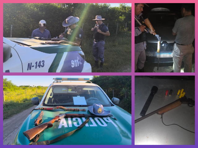 En el vehículo transportaban una escopeta calibre 16 marca Rossi, cinco cartuchos y una linterna. Los ocupantes manifestaron que se encontraban cazando en la zona, aunque no poseían documentación habilitante. Por tal motivo, se procedió al secuestro de los elementos y se iniciaron actuaciones por supuesta infracción a la Ley 1429-R de Caza, con intervención de la Dirección de Parques, Áreas Protegidas y Biodiversidad.