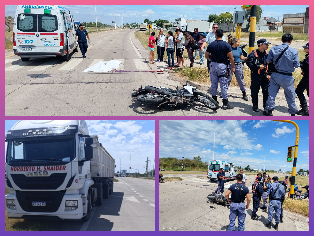 El siniestro fue protagonizado por una motocicleta Honda Wave de 110cc, en la que se desplazaba una mujer de 25 años, identificada como María Victoria Cintas Bougliotis, y un camión Iveco Hi-Road, conducido por un hombre de 31 años oriundo de la provincia de Santa Fe.