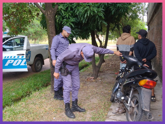 El procedimiento tuvo lugar a las 10, cuando los efectivos realizaban recorridas de prevención por la intersección de las calles Niños Boronat y Ezequiel. En ese punto, interceptaron el paso de dos hombres, de 21 y 23 años, quienes se desplazaban a pie trasladando una motocicleta tipo 110cc a su lado.