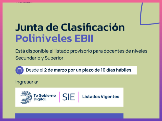 Para acceder al listado, los docentes deben ingresar a la plataforma Tu Gobierno Digital (www.gobiernodigital.chaco.gob.ar) y dirigirse a la aplicación del Sistema Integral de Educación (SIE), en el apartado de listados vigentes.