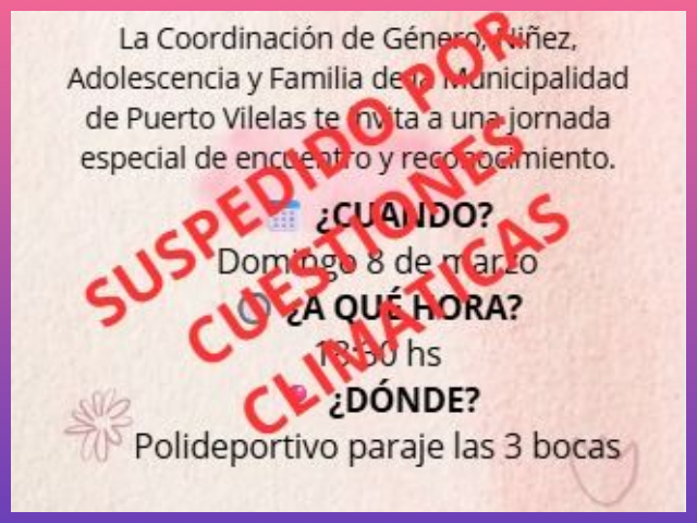La actividad estaba programada para realizarse en el Polideportivo Paraje Las 3 Bocas, en el marco de la conmemoración del Día Internacional de la Mujer. Sin embargo, desde el área organizadora explicaron que la decisión fue tomada con el objetivo de priorizar la seguridad y el bienestar de todas las personas que iban a participar del evento.