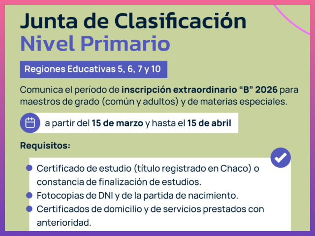 Los interesados deberán presentar la siguiente documentación: certificado de estudios (título registrado en Chaco) o constancia de finalización de estudios; fotocopia de Documento Nacional de Identidad (DNI) –frente y dorso–; y fotocopia de partida de nacimiento.
