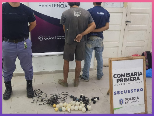 Entre los objetos secuestrados se encuentran una llave de paso con tramos de cañería de PVC, 26 portafocos de color negro y 15 focos blancos, diversos retazos de cables negros y blancos.