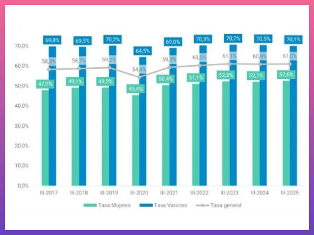 Sin embargo, el documento detalla que, mientras la tasa de actividad general se ubicó en 61%, al desagregar por género se observa que la tasa de actividad femenina fue del 52,6% y la masculina del 70,1%. Esto evidencia una brecha de 17,5 puntos porcentuales entre ambos grupos en la tasa de actividad.