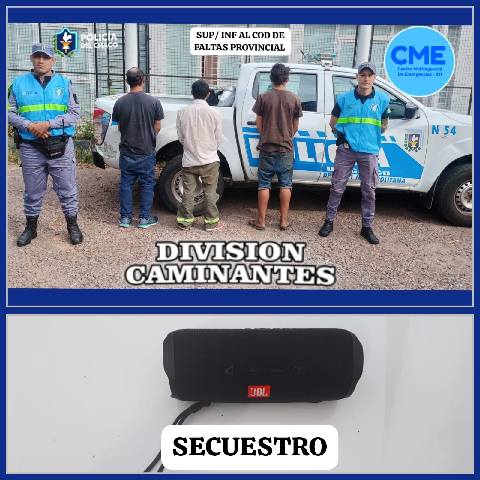 Durante el operativo, los efectivos observaron que uno de los hombres tenía en su poder un parlante marca JBL de color negro. Al ser consultado sobre la procedencia del equipo, no pudo brindar una explicación válida ni acreditar su propiedad, por lo que se procedió al secuestro del elemento.