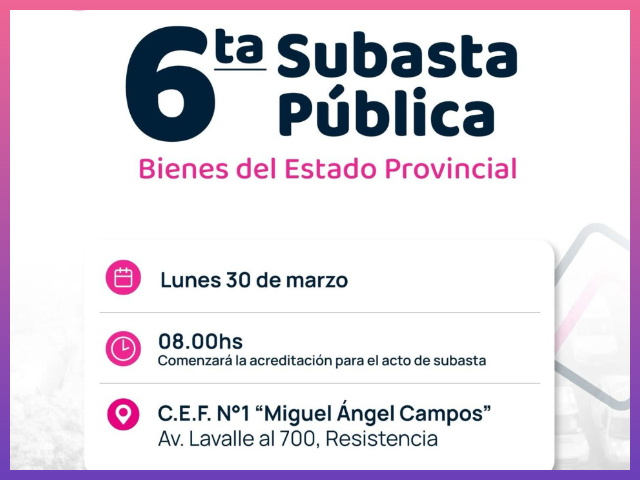 Por otra parte, se informó que los interesados podrán acceder a la exhibición previa de los bienes los días 26 y 27 de marzo, de 9:00 a 12:00 horas, y el 28 de marzo, de 9:00 a 17:00 horas, en el predio ubicado sobre avenida Martina y calle S/N, en el galpón “La Mística”.