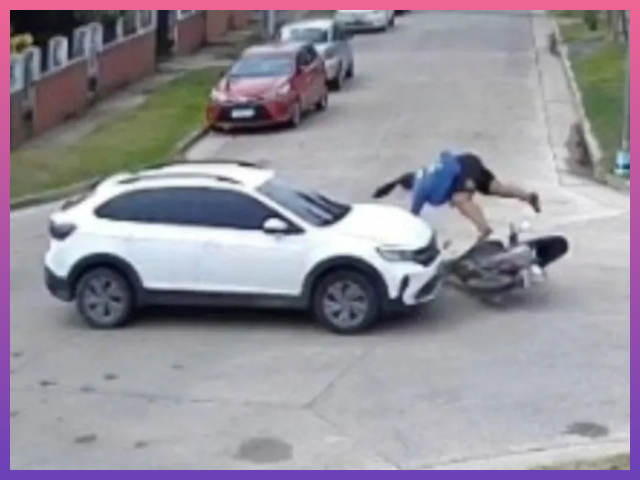 La secuencia del choque quedó registrada en video y muestra el momento exacto en que el motociclista “vuela” tras el impacto.