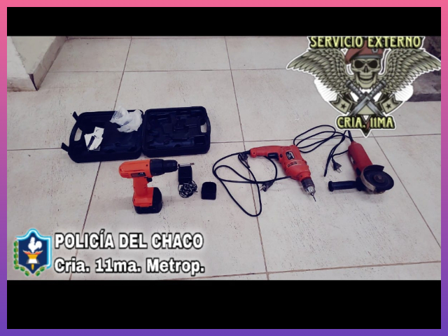 Tras unas recorridas por la zona, lograron dar con este quien en su poder tenía dos taladros, una amoladora y una caja con mechas.