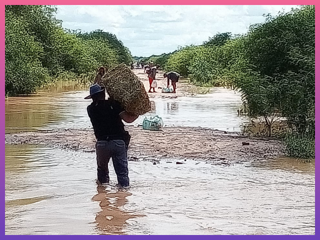 Uno de los puntos más comprometidos es el camino vecinal que conecta la localidad con el paraje Las Flores. Allí, el corte se inicia a unos 6 kilómetros del pueblo y se extiende aproximadamente 12 kilómetros cubiertos de agua, lo que impide completamente el tránsito vehicular.