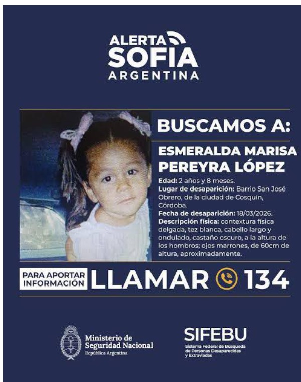De acuerdo a la información oficial, la niña desapareció el 18 de marzo de 2026 en el barrio San José Obrero de Cosquín. La menor presenta contextura delgada, tez blanca, cabello largo, ondulado y castaño oscuro, a la altura de los hombros, ojos marrones y una estatura aproximada de 60 centímetros.