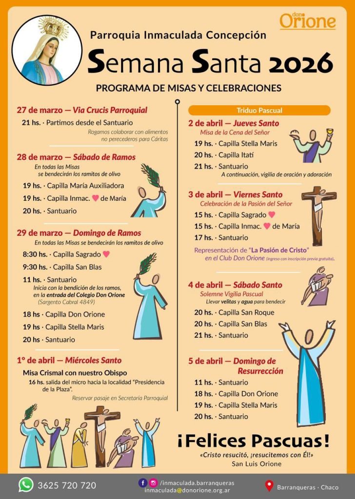 El Sábado Santo se vivirá la Solemne Vigilia Pascual en diferentes capillas, mientras que el Domingo de Resurrección, el 5 de abril, se celebrarán misas en distintos horarios, culminando así una semana de profunda reflexión y encuentro espiritual.