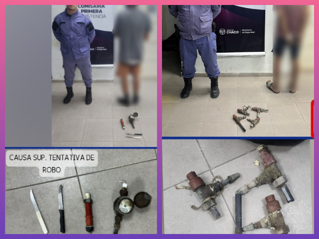 Al arribar al lugar, los agentes procedieron a la demora de un hombre de 41 años, a quien se le secuestró un medidor de agua potable, un caño de PVC y dos cuchillos. En el mismo contexto, personal de la División Patrulla Preventiva demoró a un segundo sujeto de 28 años, quien tenía en su poder cuatro llaves de paso y un cuchillo.