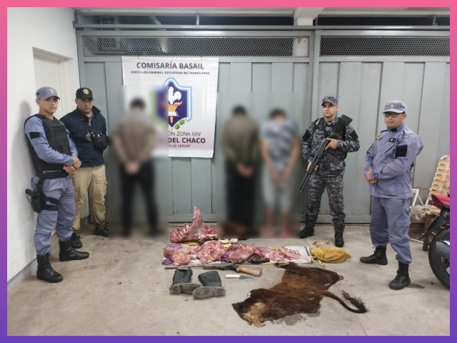 Durante la requisa, se constató que las bolsas contenían aproximadamente 40 kilos de carne vacuna. Además, se secuestró un rifle tipo carabina calibre .22 sin marca visible ni número de serie, con un cartucho del mismo calibre, y un cuchillo de unos 30 centímetros y su correspondiente vaina. Los demorados no pudieron acreditar la procedencia del producto cárnico.