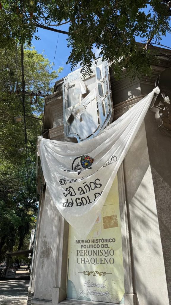 La fachada del edificio fue intervenida con el pañuelo blanco, símbolo de las Madres y Abuelas de Plaza de Mayo, como gesto de memoria viva, resistencia y compromiso con los derechos humanos. Esta acción fue acompañada por la Comisión Provincial por la Memoria, el colectivo de Arte de Acción Chaqueño y Contemporáneo, y las organizaciones de la Comunidad Organizada: Legado Joven y Villa Río Negro Florece.