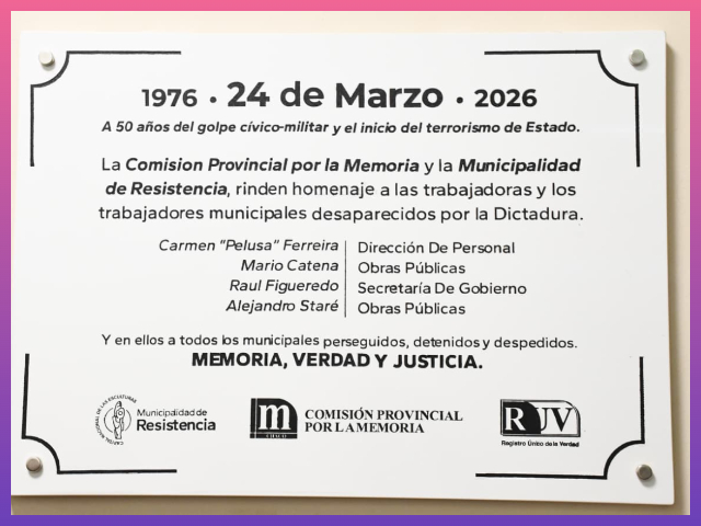 La placa reza: “A 50 años del golpe cívico-militar y el inicio del terrorismo de Estado. La Comisión Provincial por la Memoria y la Municipalidad de Resistencia, rinden homenaje a las trabajadoras y los trabajadores municipales desaparecidos por la Dictadura”.