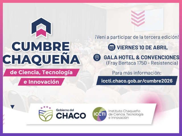 Para conocer las últimas novedades de la Cumbre Chaqueña de Ciencia, Tecnología e Innovación, se invita a la comunidad a seguir las redes sociales del ICCTI (@icctichaco en Facebook e Instagram) y visitar el sitio web iccti.chaco.gob.ar.