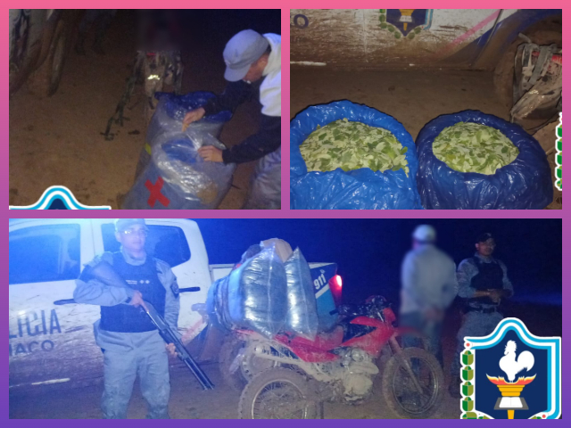 Anoche, cerca de las 22:30, los agentes de la Comisaria El Sauzalito, realizaban tarea de prevención en inmediaciones del paraje Santa Rita, donde demoran la marcha de una motocicleta Honda XR125 cilindradas, guiada por un ciudadano de 42 años, a simple vista transportaba bolsas de gran tamaño en la parte trasera. El mismo, manifestó que trasladaba hojas de coca, constatándose en el lugar una carga aproximada de 50 kilogramos.