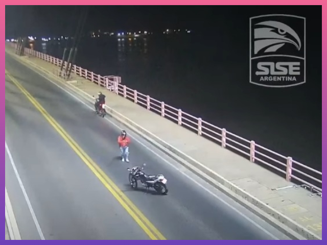 La secuencia fue captada por las cámaras del Sistema Integral de Seguridad y Emergencias (SISE) y muestra cómo, aprovechando la escasa circulación vehicular en ese momento, los ocupantes de las motos frenaron sobre uno de los carriles del viaducto que conecta las provincias de Chaco y Corrientes.