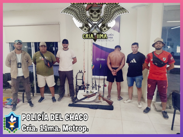 Al ingresar al rancho donde se ocultaba el sospechoso, el sujeto intentó escapar por una ventana, pero fue reducido por el personal policial. En el interior se secuestraron siete cañas de pescar, nueve reeles de distintas marcas y una escopeta calibre 12/70 doble caño superpuesta con su estuche de transporte.